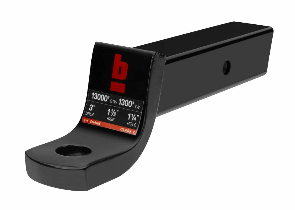 This bROK ball mount provides optimal trailer towing with a 3-in drop from the top of your receiver to aid in leveling your trailer while towing. The bROK ball mount is made of welded steel with black powder coat finish for years of service. The 2-1/2-in shank accommodates class V receivers, a 5/8-in hole for receiver pin or lock and a 1-in hole for the hitch ball shank.
