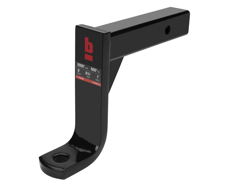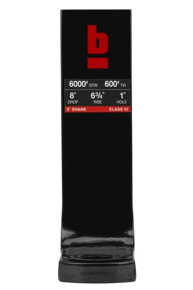 This bROK ball mount provides optimal trailer towing with a 8-in drop from the top of your receiver to aid in leveling your trailer while towing. The bROK ball mount is made of welded steel with black powder coat finish for years of service. The 2-in shank accommodates all class III-IV receivers, a 5/8-in hole for receiver pin or lock and a 1-in hole for the hitch ball shank.