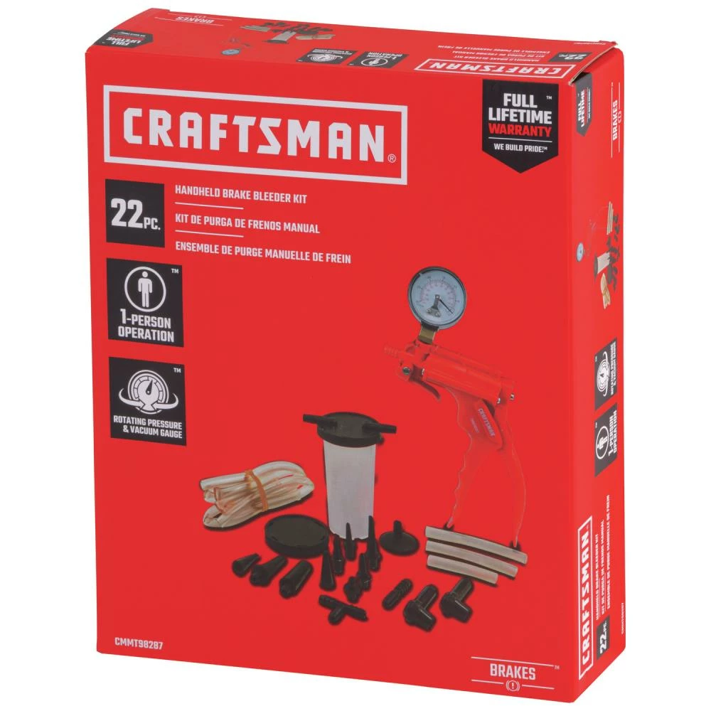 Bleeding your vehicle’s brakes is a difficult job to do alone. The CRAFTSMAN® Handheld Brake Bleeder turns a 2-person job into a 1-person job to help make automotive maintenance more convenient. The hand-operated pump connects to the brake caliper bleed valve and uses vacuum pressure to pull brake fluid through the system. The tool kit can also be used for other automotive diagnostic and mechanical tests that require vacuum pressure.