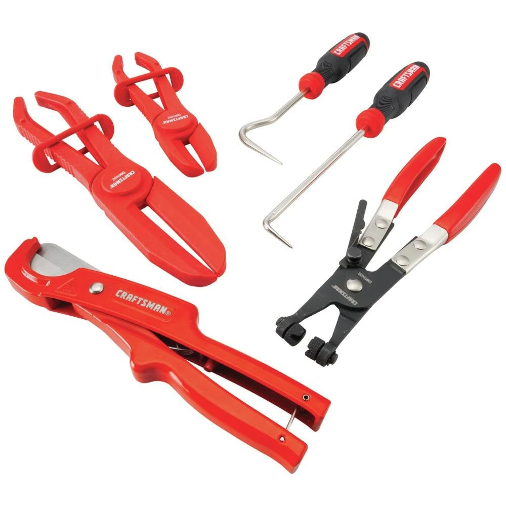 The CRAFTSMAN® Cooling System Kit provides you with some of the most common tools needed to service your vehicle’s engine cooling system. Line clamp pliers allow you to close-off hoses to avoid spilling fluid. Hose clamp pliers help easily remove metal spring-type (Corbin-style) hose clamps. Two different style hose remover hooks provide leverage and extended reach to help remove stubborn hoses and seals. The included hose cutters allow you to cut old or new rubber hose during the system repair.