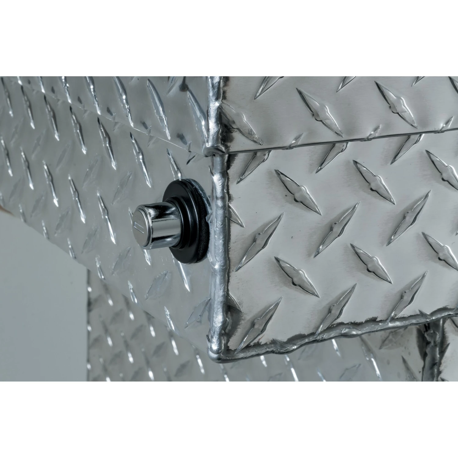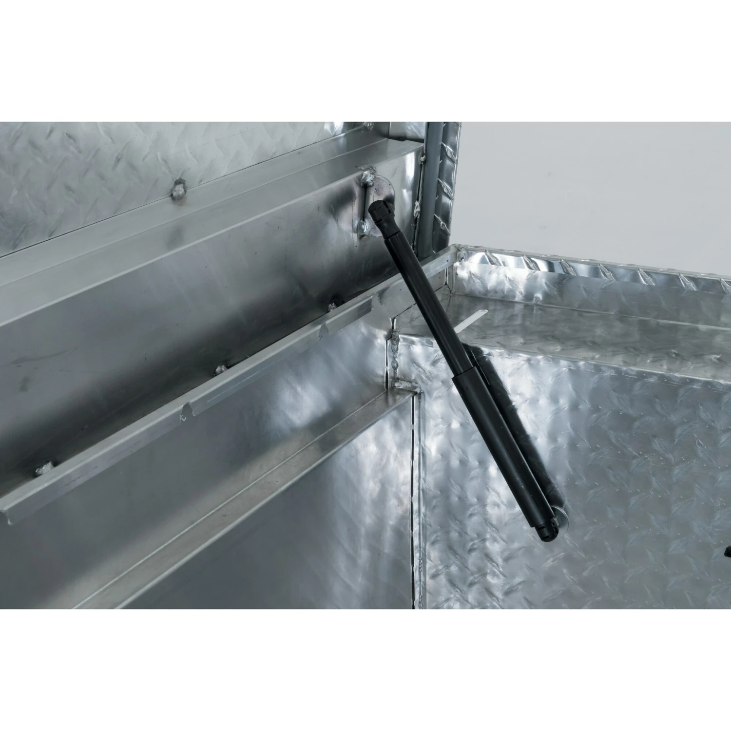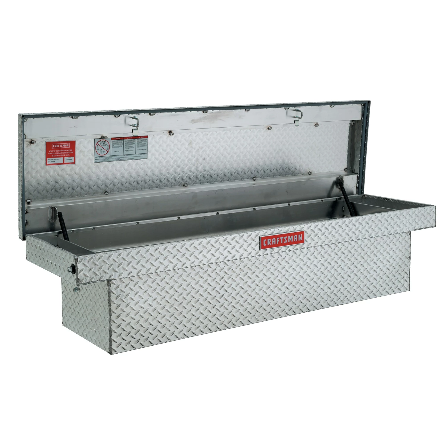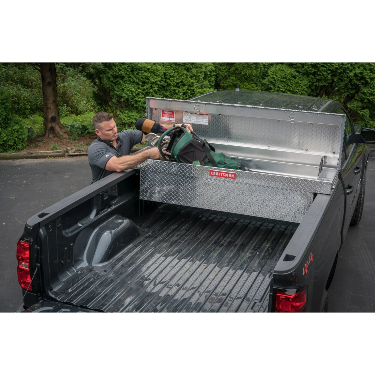The CRAFTSMAN Aluminum Crossover Truck Tool Box is engineered with fully welded aluminum construction to ensure lasting durability. Its slim, space-saving design gives you more truck bed room to store other items. The one-touch access push button locks on both sides and automatically opens with the smooth-opening gas springs. The weather-block rubber seal keeps your stored items protected from the elements, so they are dry and ready to use. It is keyed with a locking paddle handle that latches to provide extra security and protection of your stored loose items. Includes a drill-free mounting kit and a removable sliding tool tray that keeps your tools organized, accessible, and ready for any job. Fits most full-sized pickups (see product images for compatibility).
