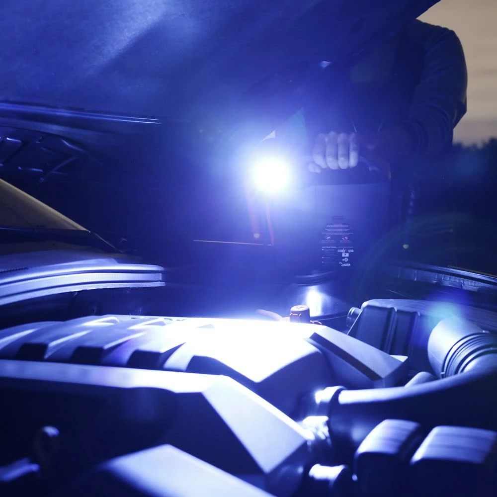 - The tough all-weather design also features a 12V DC power port, LED battery fuel gauge, and a bright LED work light