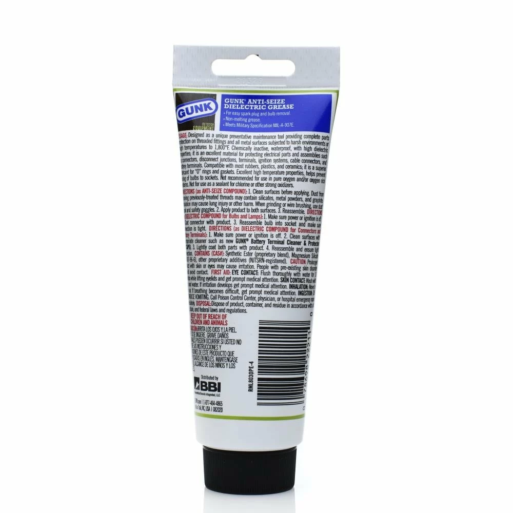 GUNK Anti-Seize Dielectric Grease is a dual purpose, synthetic, non-drying dielectric paste and anti-seize compund. Meets Military Specification MIL-A-97E. Designed as a unique preventative maintenance tool providing complete parts protection on threaded fittings and all metal surfaces subjected to harsh environments or high temperatures. Chemically inactive, waterproof, with high dielectric properties; it is an excellent material for protecting electrical parts and assemblies such as connectors, disconnect junctions, terminals, ignition systems, cable connectors, and battery terminals.