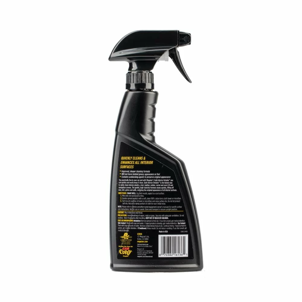 Use Meguiar’s Quik Interior Detailer Cleaner to quickly and easily clean your car’s interior surfaces, including plastics, vinyl, leather, rubber, metal and even LCD and navigation screens. The gentle, high-lubricity formula quickly cleans, lifting dust, dirt, grime and spills while restoring the original appearance of all interior surfaces. Sun-blocking agents in this interior protectant guard against aging, fading, cracking and drying, while an improved deeper cleaning formula leaves a dark, rich shine without a greasy appearance or feel. Great for fast touch-ups, this interior car cleaner comes in a convenient spray bottle for easy application.