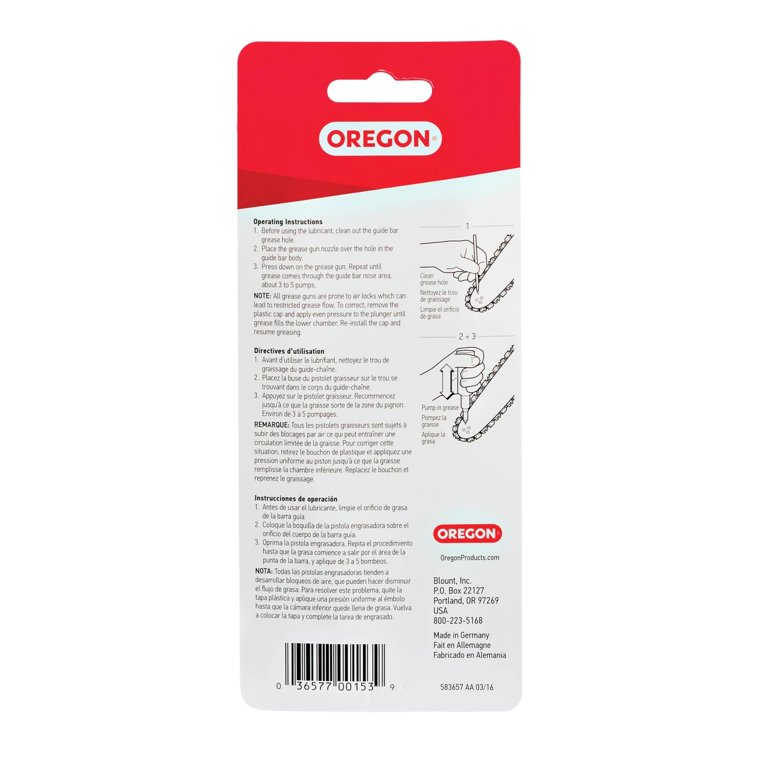 Oregon’s Grease Gun is pre-loaded with all purpose lubricant – it’s filled, easy to use and ready to go. The steel nose nozzle features a spring loaded pump action for sprocket nose guide bars. It’s easy to refill, and is effective in preventing premature wear and tear, especially on guide bar noses. Suitable for most chainsaw makes and models. The one-handed operation is self dispensing, and is made from high quality plastic materials which can withstand changes in temperature. For use all year round. • Box contains: 1 x Grease Gun for Chainsaws • Pre loaded all purpose lubricant • One hand operation with pointed nozzle for cup-shaped grease fittings, self dispensing • Manufactured from high-quality plastic materials withstanding changes in temperature • Transparent, visual control of fill level so you can see how much oil is left without opening the cap About us: 1946 ushered in a better way of woodcutting when logger Joseph Buford Cox realized how easily timber-beetle larvae can chew through timber, creating the first revolutionary Oregon saw chain that duplicated their alternating C-shaped jaws in steel. From the invention of modern saw chain to research innovations that reduce injury-causing kickback, Oregon has always been the industry leader. There’s a reason why we’re the world’s number-one in saw chain, guide bars, sprockets, forestry accessories, lawnmower blades and outdoor equipment parts.