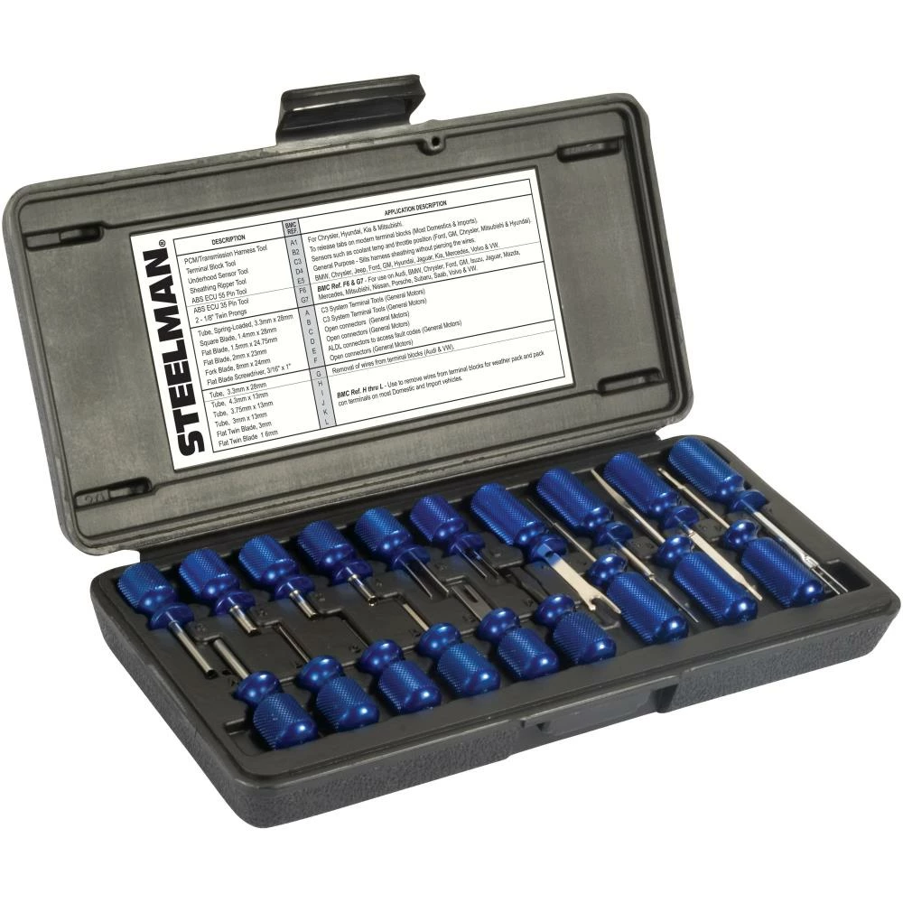 As many technicians know, automotive electrical terminal blocks are designed to hold tightly and not let go or loosen their grip on wires amid the bumps and vibrations experienced in modern cars and trucks. When the time comes to replace or repair those terminals or wires, special tools are needed to separate them. The 95978 STEELMAN 19-Piece Master Terminal Tool Kit was designed to separate wires from their terminal blocks without causing damage to either. Made with knurled and hard stamped aluminum handles these connector pin release and sensor tools take the aggravation out of terminal repair. The tools included in this kit will work on terminals found in a wide variety of Audi, BMW, Chrysler, Ford, GM, Hyundai, Isuzu, Jaguar, Jeep, Kia, Mazda, Mercedes, Mitsubishi, Nissan, Porsche, Saab, Subaru, Volvo, and Volkswagen vehicles. A convenient application reference chart listing tools, measurements, and compatible manufacturers and uses is included inside the blow-molded plastic storage case. The following tools are included in this set: PCM/transmission harness tool, terminal block tool, under hood sensor tool, sheathing ripper tool, ABS ECU 55 pin tool, ABS ECU 35 pin tool, 2-1/8-inch twin prongs, 3.3mm x 28, 4.3mm x 13mm, 3.75mm x 13mm, and 3mm x 13mm tube tip, 3mm and 1.6mm flat twin blade, spring-loaded 3.3mm x 28mm tube, 1.4mm x 28mm square blade, 1.5mm x 24.75mm and 2mm x 23mm flat blade, 8mm x 24mm fork blade, and a 3/16-inch x 1-inch flat blade screwdriver.