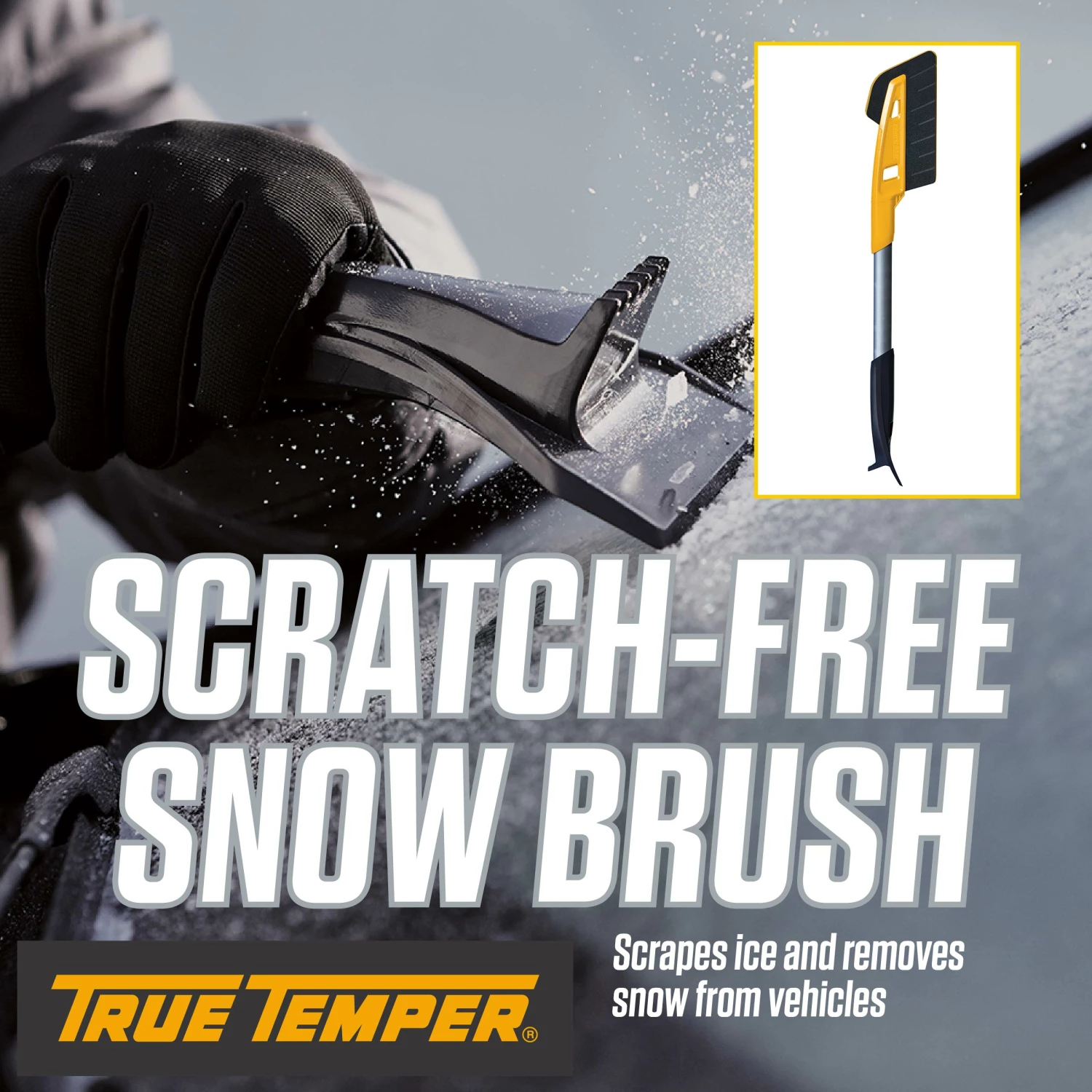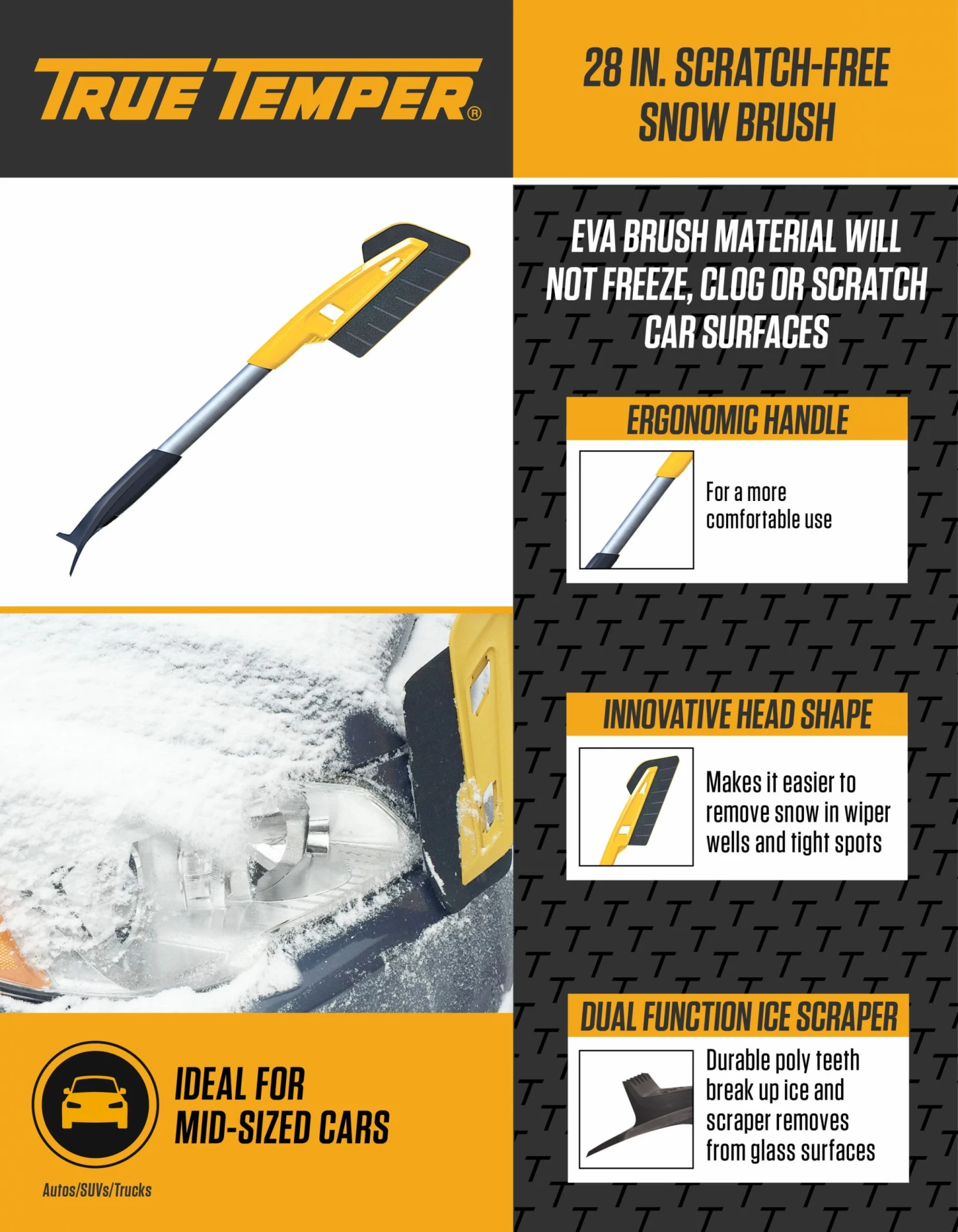 The 28 in. True Temper Scratch-Free Snow Brush is a snow brush that won’t scratch your car. It features an innovative head design, elliptical aluminum handle end scraper for ice removal. The head uses EVA foam, a durable material that is freeze and clog resistant and also keeps your car scratch-free. EVA foam is also used in professional car washes to clean cars while also protecting them unlike traditional brush bristles. The head shape is designed to remove snow in smaller and hard to reach areas like wiper wells, side mirrors and roof racks. The handle features a cushion grip for comfort and control.